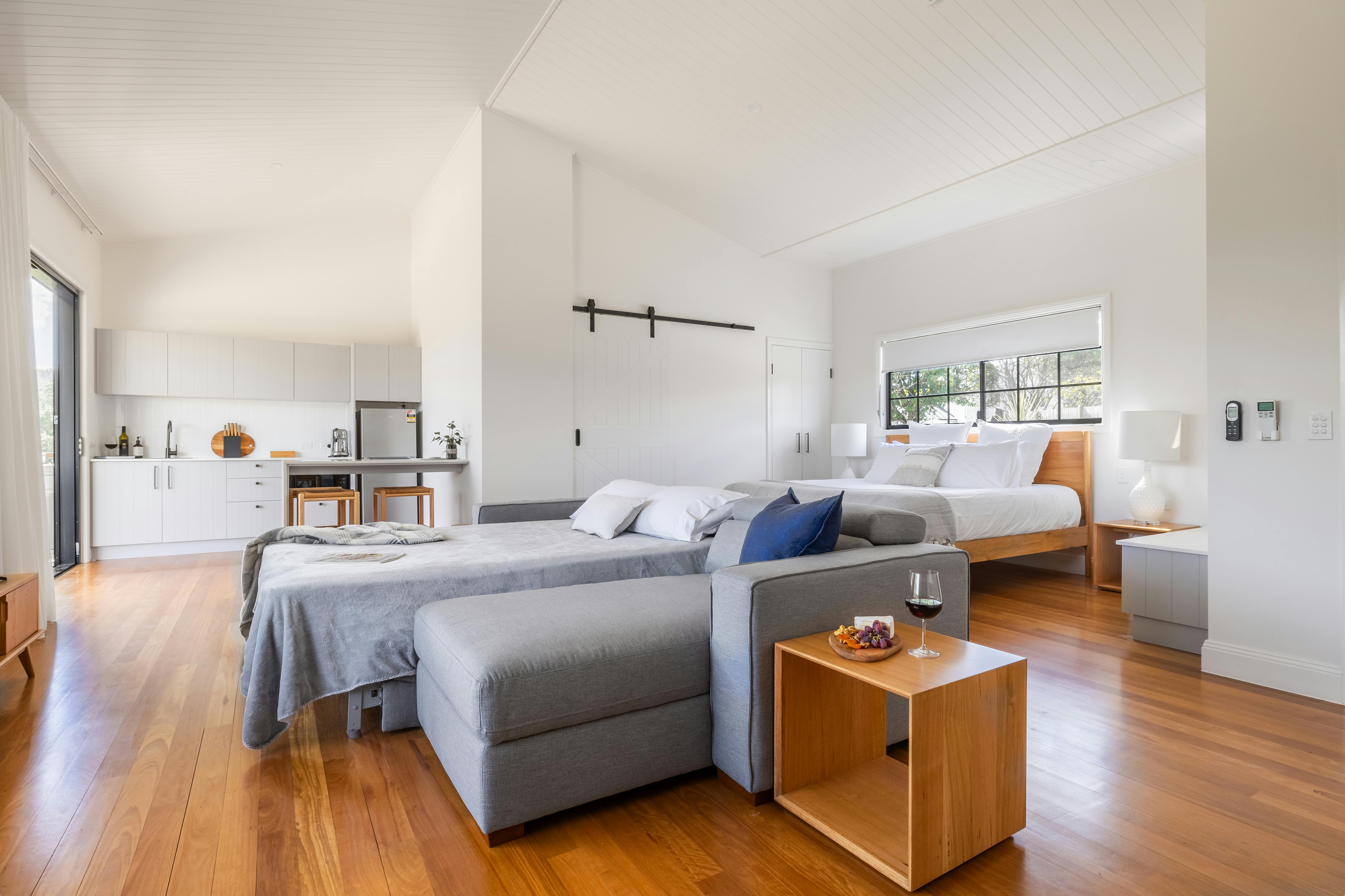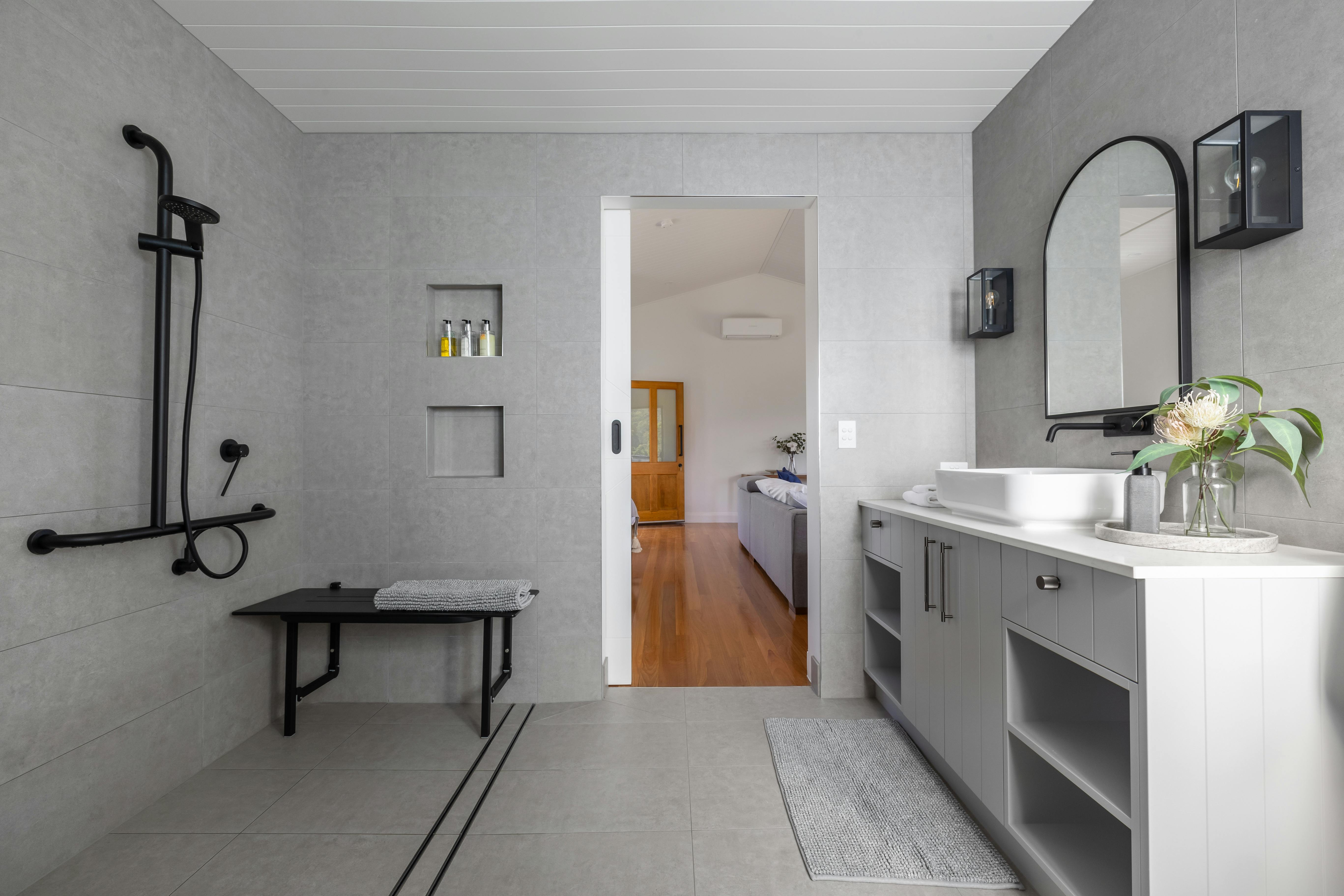 Seven Peaks has one Accessible Cabin. This Mountain View cabin has been designed to suit a young family or people with mobility restrictions. This cabin sleeps 2 guests in a king size bed - (1 additional sofabed for child or carer available on requests at an additional cost) This cabin has access via a level concrete path from the carpark and is all on one level inside (no steps). The purpose-built bathroom features a large open wet space with roll in shower, grab rails, bench seat and wheelchair accessible toilet and basin.
