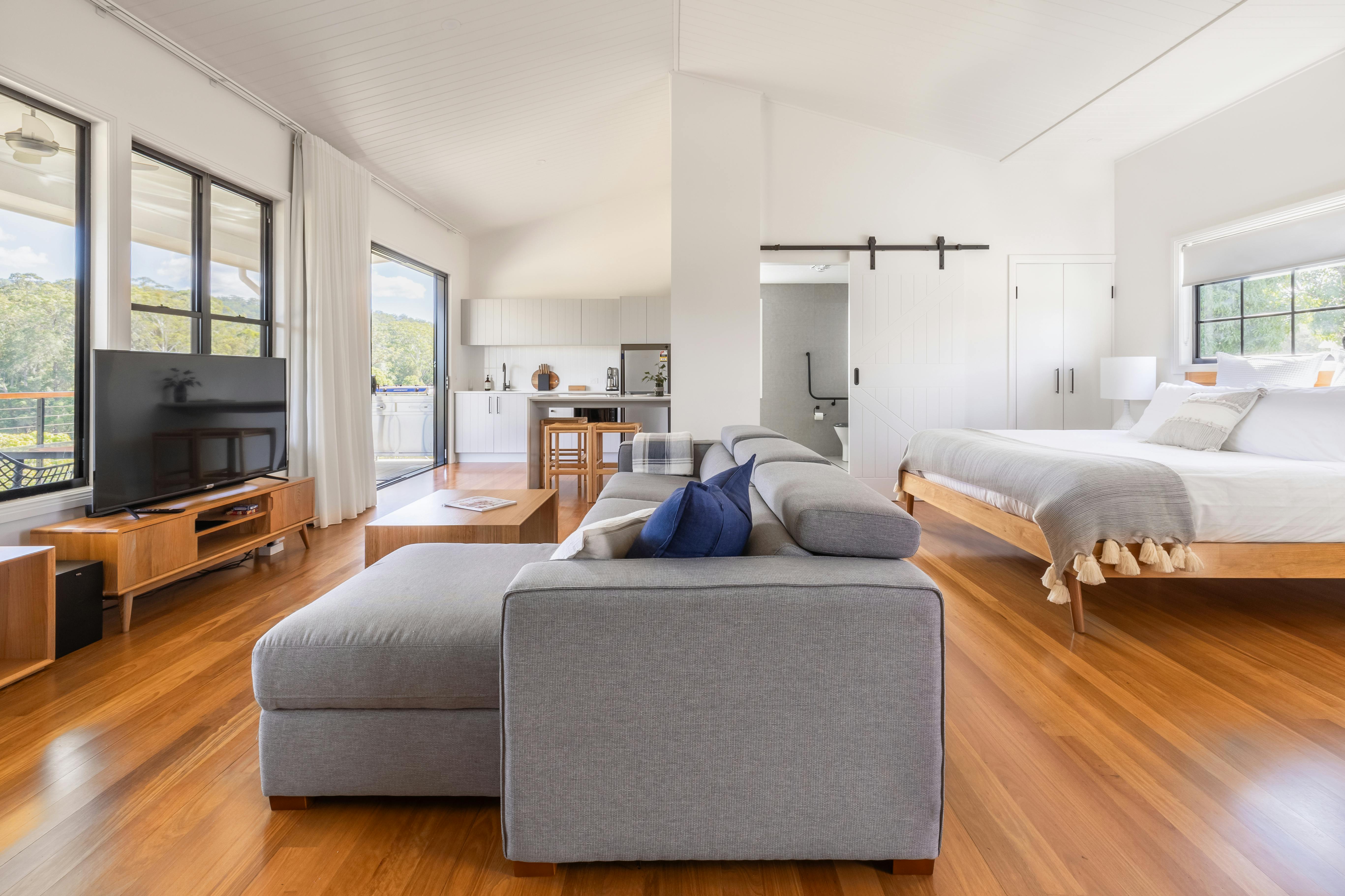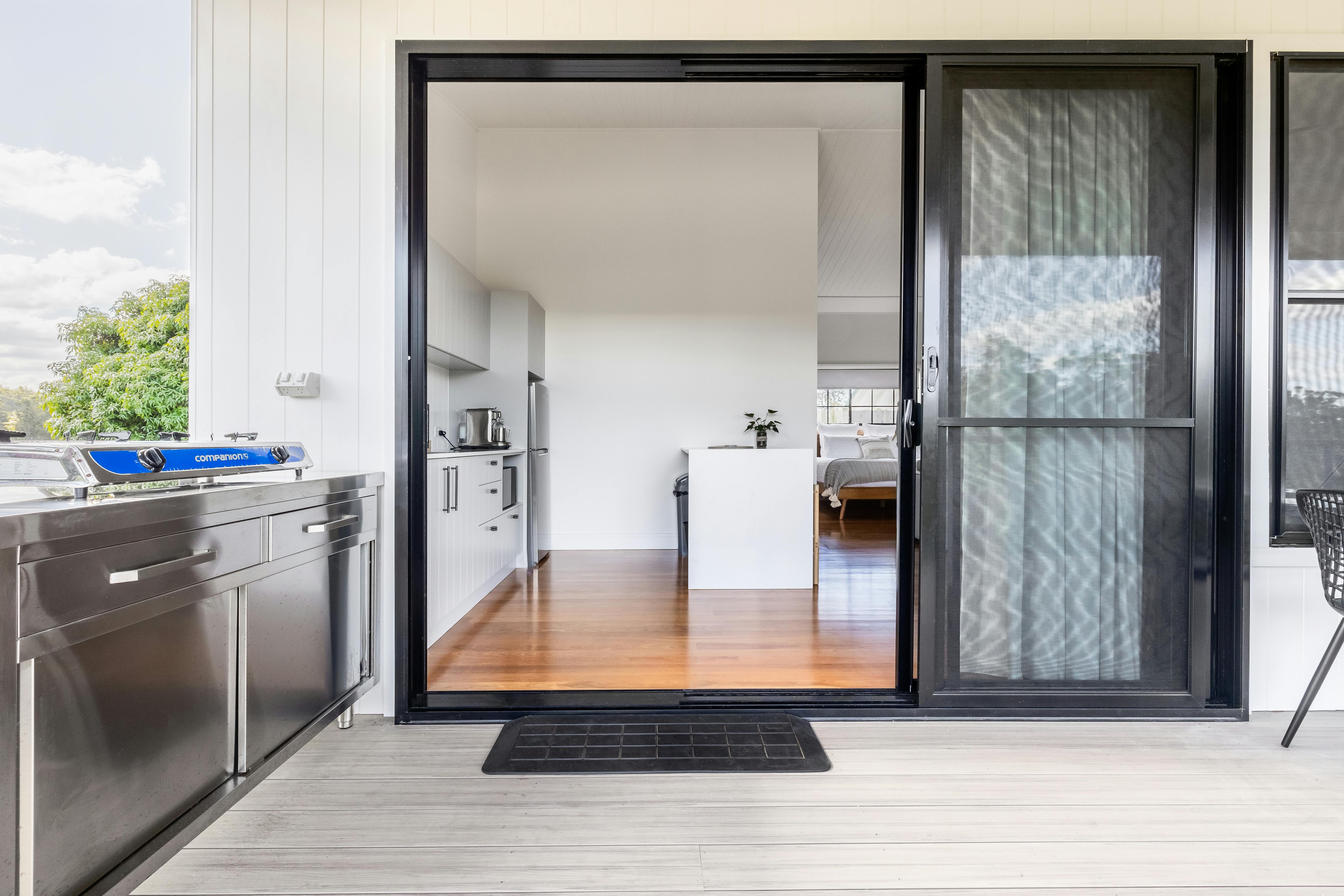This Cabin has all the amenities you expect like a kitchenette with breakfast bar, studio style bedroom with accessible bathroom, looking over an open plan living area with fireplace and views to the rainforest. Large sliding doors open out to a spacious deck with outdoor cooking facilities and a laundry with washer and dryer for your convenience. Our cabins are fully self-contained. We provide you with bedding, bath towels and guest amenities. In the kitchen you will a coffee machine, fridge, microwave, electric frypan, utensils, cutlery, crockery, and glassware. Tea and coffee supplied. Queensland offers the perfect climate for outdoor cooking. Your balcony has its own outdoor kitchen electric cooktop for those who like to cook up some culinary delights.